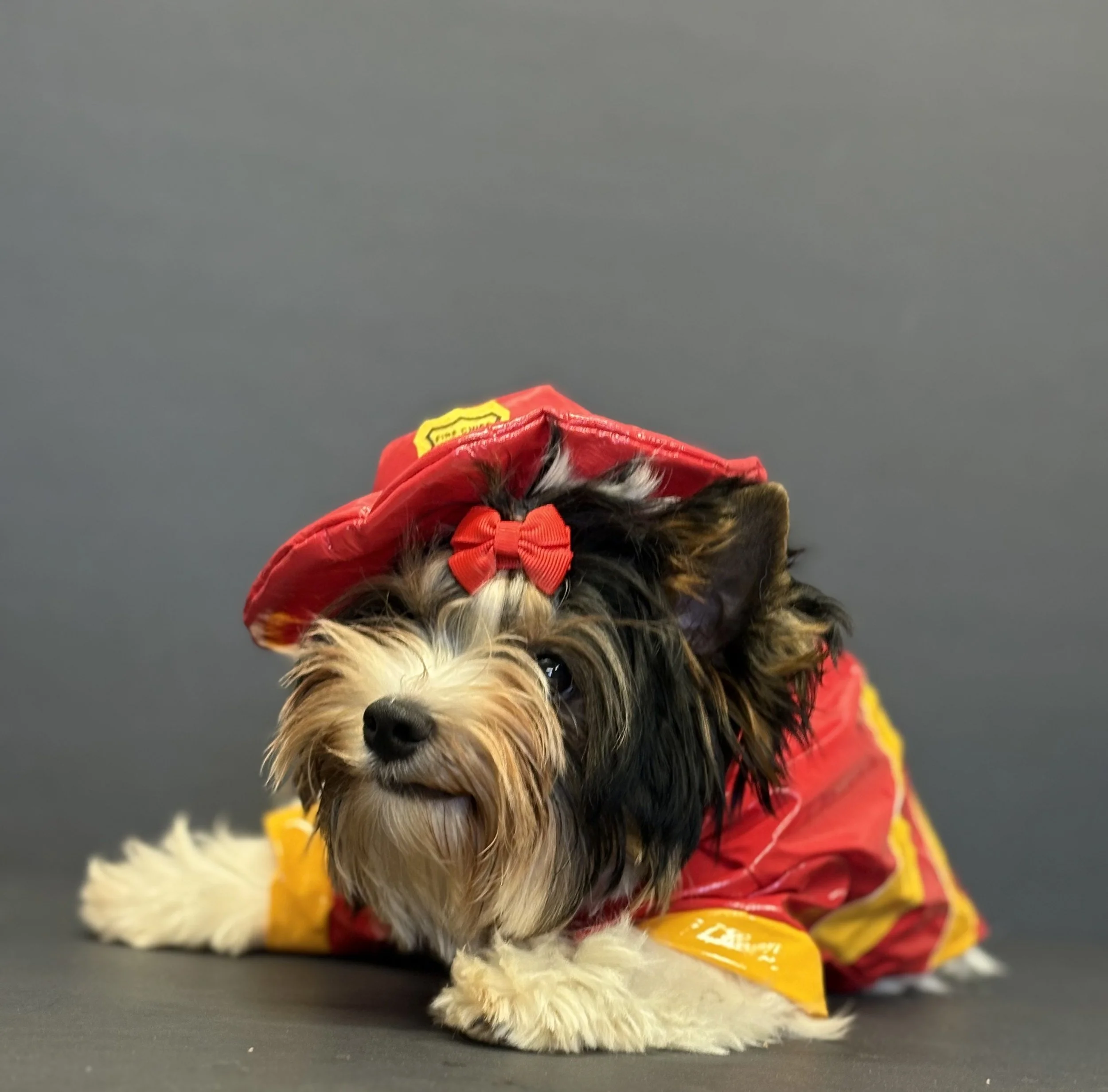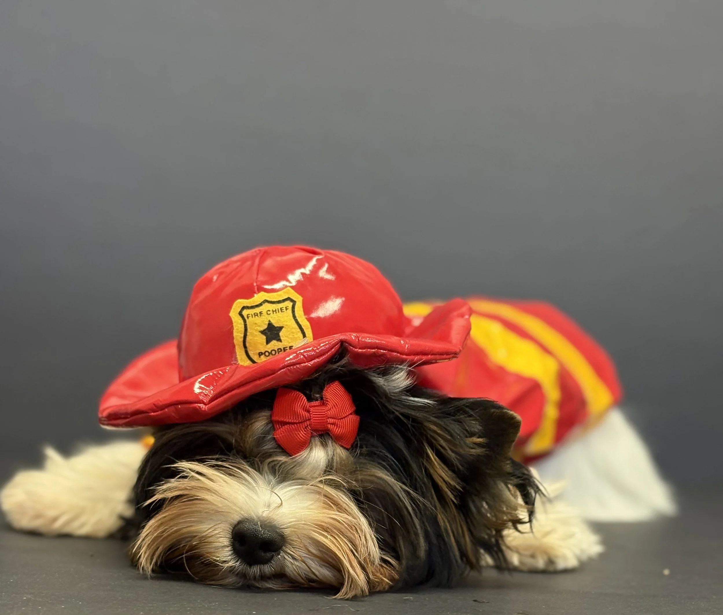A small dog wearing a firefighter costume, including a red firefighter hat with a badge that says 'Fire Chief', a red bow, and a red and yellow firefighter coat, lying down on a gray surface with a gray background.
