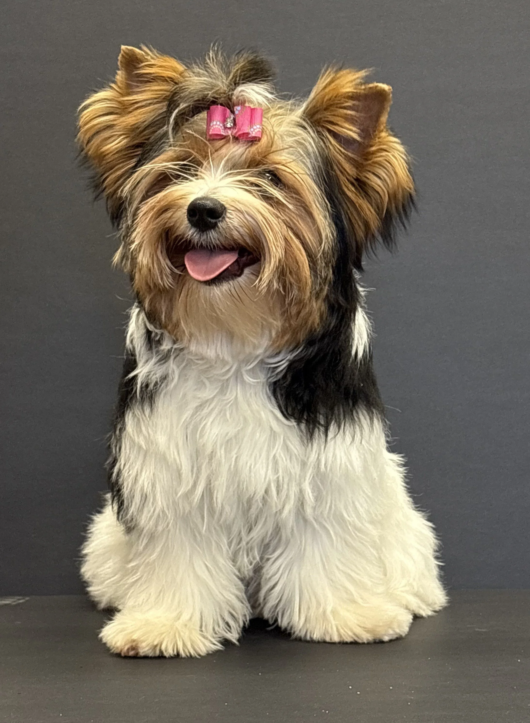 A Biewer Terrier, pink bow on its head, sitting against a black background.