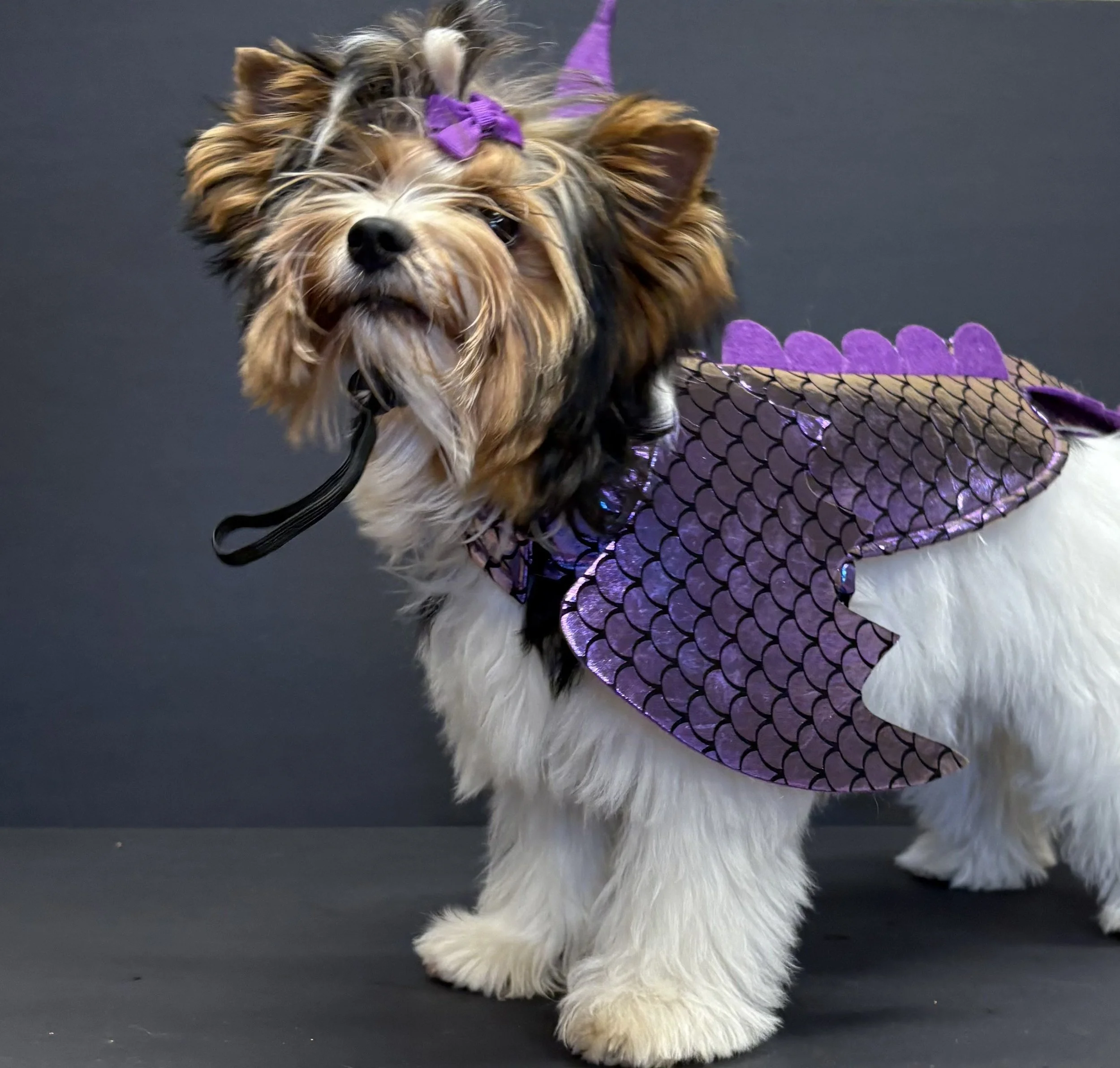 A small dog dressed in a purple dragon costume with a mane and wings, standing on a black surface against a black background.